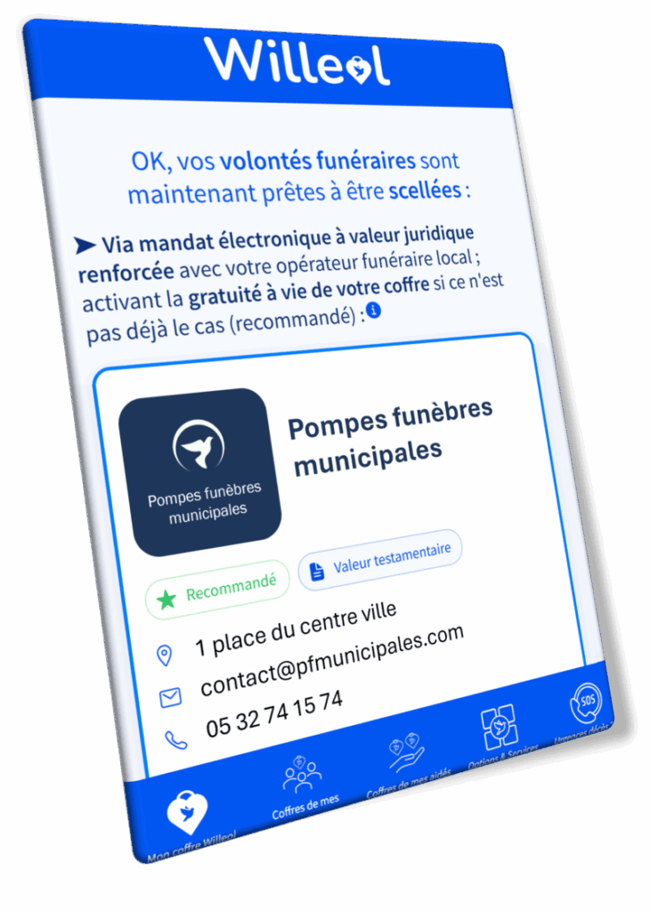 Offrez-leur un coffre Willeol pour les connecter à votre agence 24h/24 de façon exclusive pour tous leurs besoins funéraires (volontés, prévoyance, urgence décès, marbrerie, démarches) ; et développez votre activité de façon inédite.
