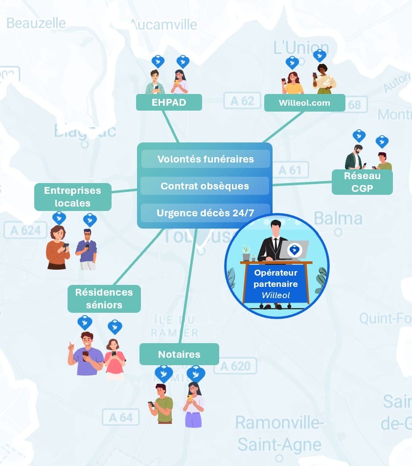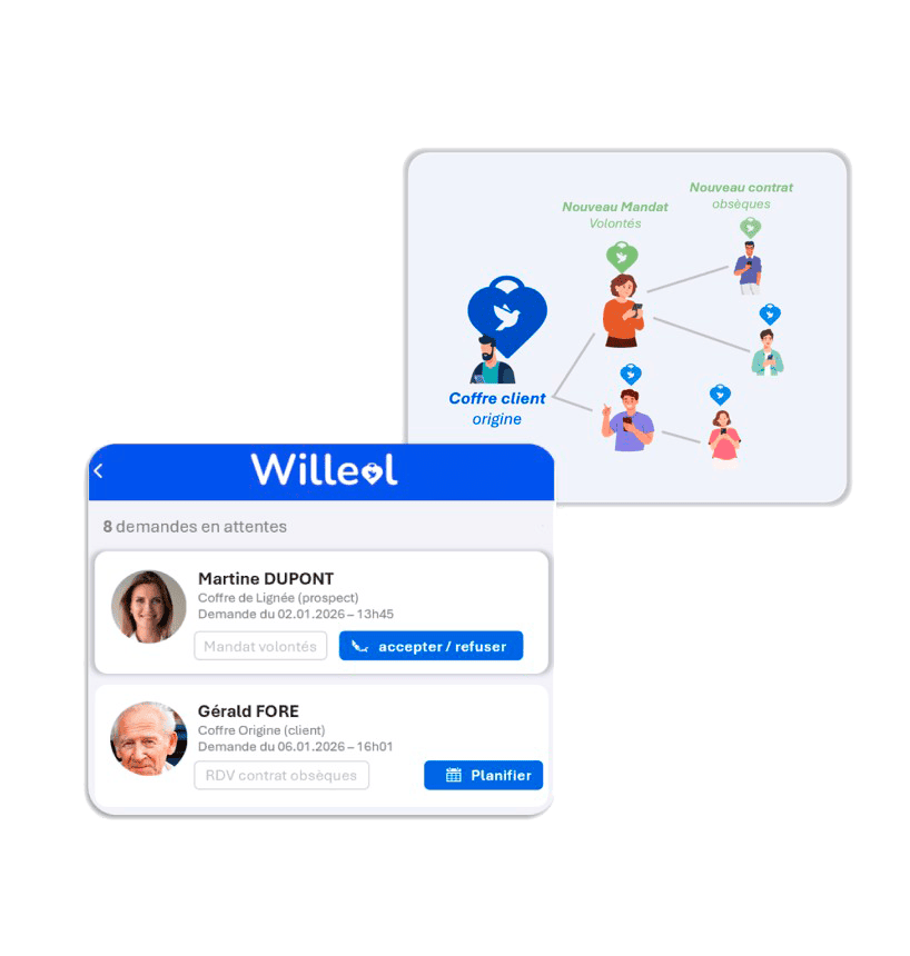 En devenant partenaire Willeol sur votre secteur, vous profitez du déploiement, par notre équipe, du coffre-fort numérique dans les entreprises, Ehpads et résidences séniors, chez les notaires et les conseillers en gestion de patrimoine sur votre secteur. Vous êtes ainsi visible au bon endroit pour capter les volontés funéraires des familles de votre secteur, les urgence décès et les demandes de contrats obsèques en agence.