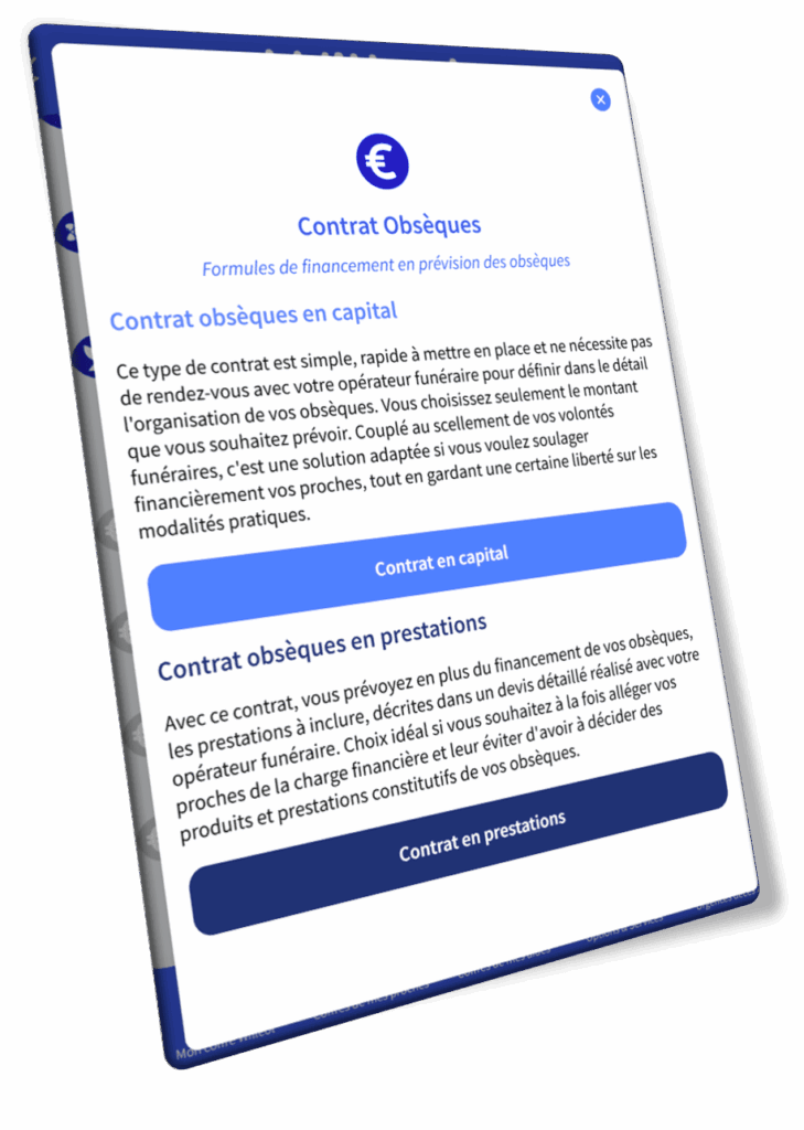 Choisissez comment vos clients et prospects peuvent souscrire leur contrat obsèques avec votre agence depuis leur coffre (plusieurs modes activables). Les contrats proposés à vos clients sur leur coffre sont ceux de votre propre fournisseur prévoyance et désignent votre entreprise 1er bénéficiaire du capital.